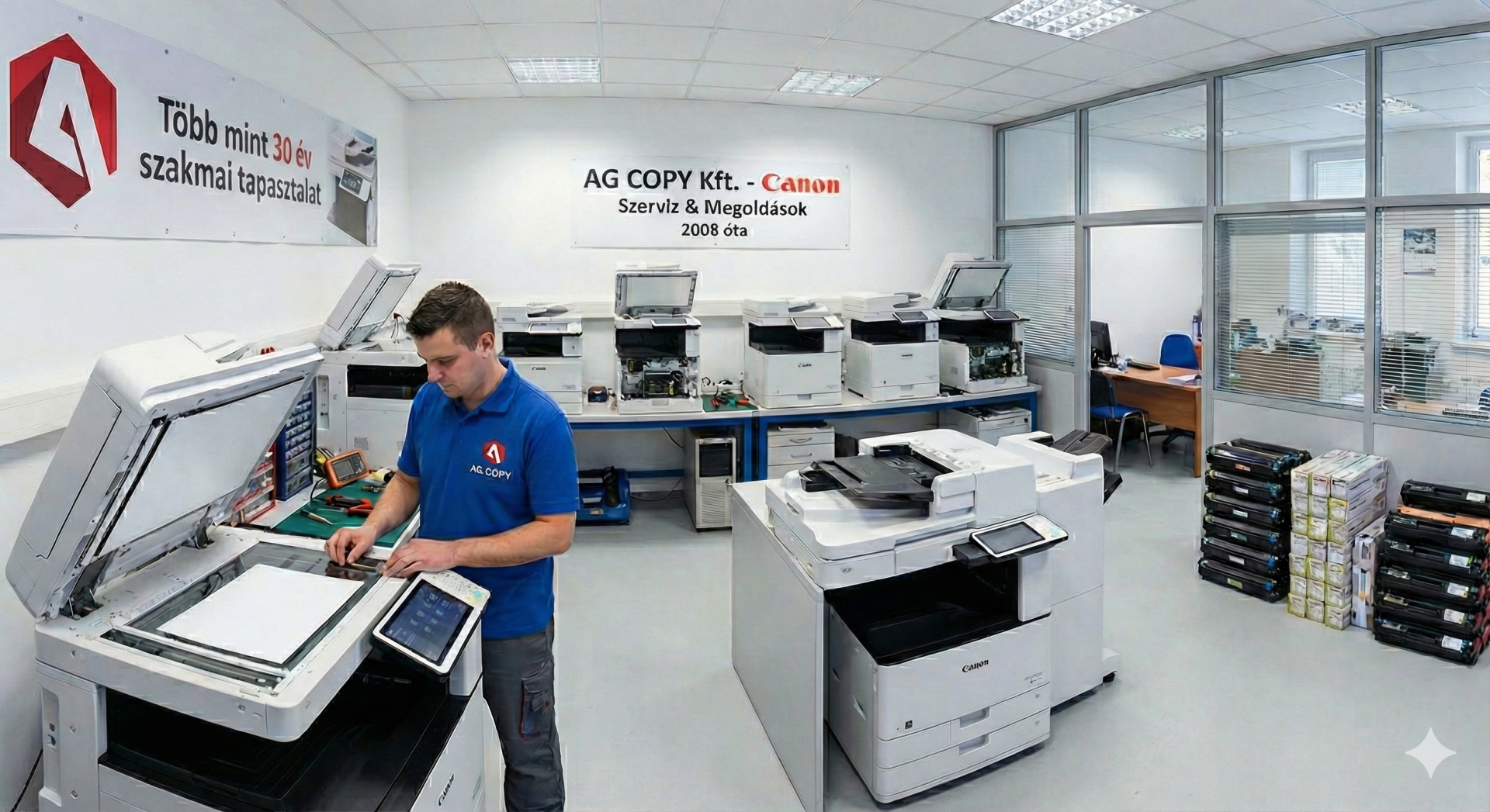 Az AG Copy szervizszolgáltatása Canon irodatechnikai készülékek javítására és karbantartására specializálódott. Szakképzett technikusaink több mint 30 éves tapasztalattal rendelkeznek, így minden meghibásodást gyorsan és hatékonyan képesek elhárítani. Legyen szó mechanikai problémáról, nyomtatási hibáról vagy szoftveres beállításról, csapatunk a lehető legrövidebb időn belül biztosítja a működő megoldást.